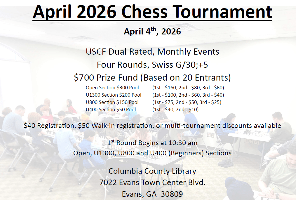 Each League Tournament will consist of 4 Rounds G/30;+5 games, Swiss style tournaments at the Columbia County Library (Room A) with four sections; Open, U1300, U800 and U400. Section Prizes are increased this year with $700 between the four sections (based on 20 Registrants).