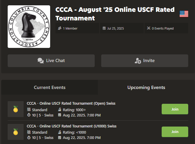 - Shortly after 5:00 the tournament director will provide an invite to the Tournament Group, “CCCA – *** Appropriate Month *** Online USCF Tournament” through each players chess.com messages. Players should go ahead and join this group.