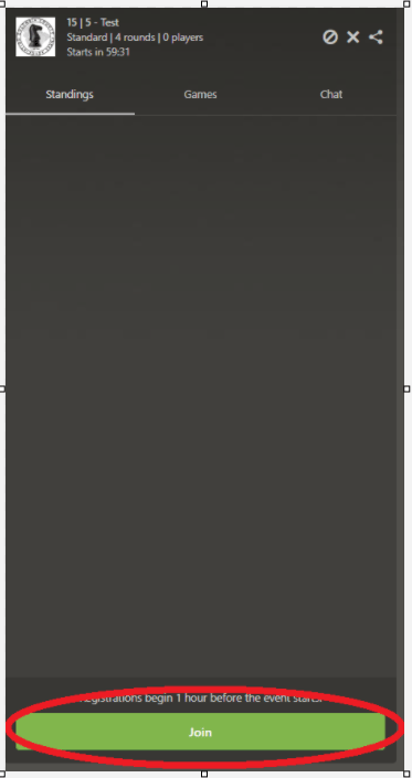 - At 6:00 pm, all players will be eligible to join their tournament games. All players should then select the “JOIN” button in the tournament screen. Without this, chess.com WILL NOT recognize that a player is participating. All players participating will be required to join prior to the completion of the first round. Chess.com will not allow tournament entry after this round.